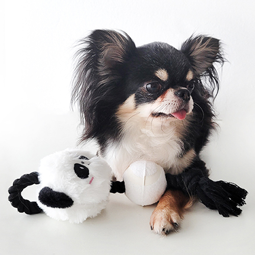 太さ約1cmのコットンロープに、キュートなパンダと直径約5cmのボールを取り付けた楽しいおもちゃです。