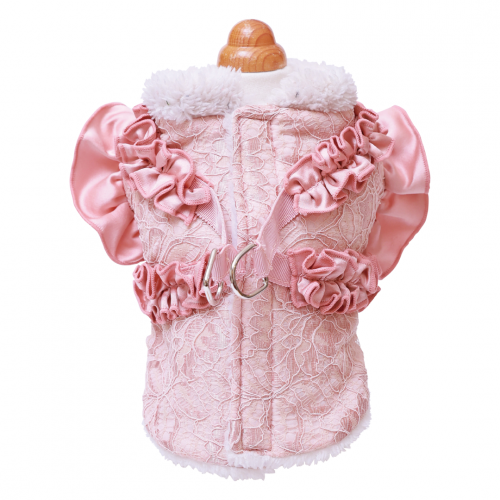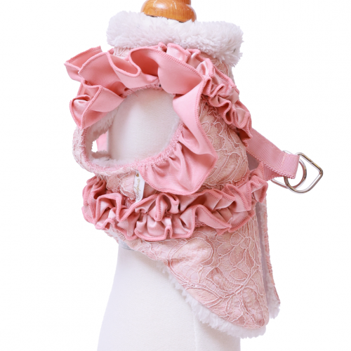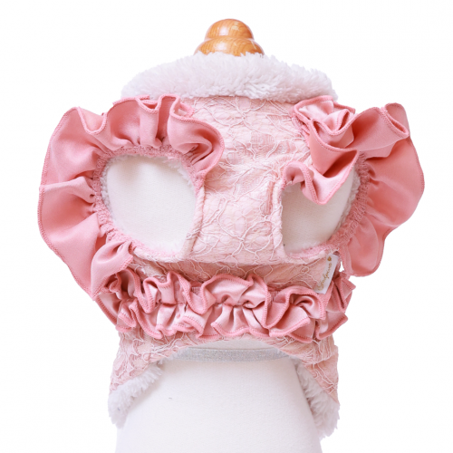 高品質のレースに張り感のあるサテンフリルをたっぷりとあしらい、裏地にはあたたかなボア生地を重ねました。