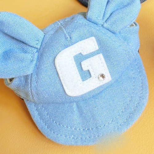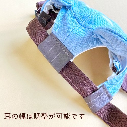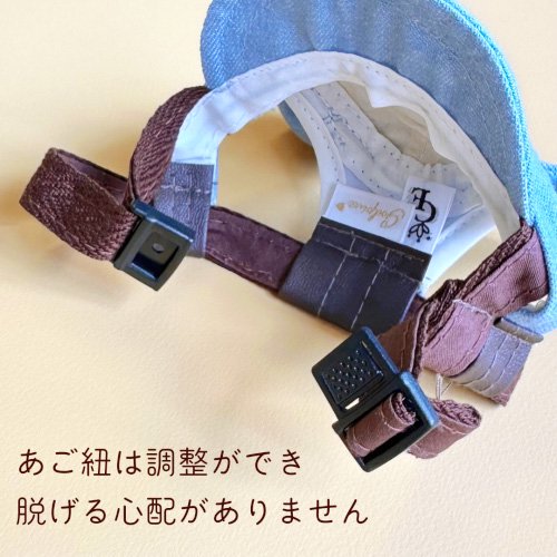 さらに、わんちゃんの体格に合わせて首紐を調整する(締める)ことでサイドの紐が引っ張られ、帽子全体に下方向へ引っ張る力が働き、固定力をアップさせています。