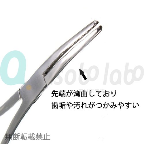 - [2]歯に沿うように先端の湾曲をあて、歯垢や汚れをつかみ取ります。