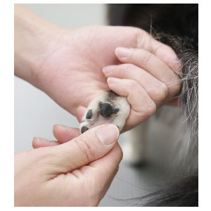 - [3] アヴァンスオイルを肉球につけます。つけにくい時は飼い主様の手のひらにオイルをためて肉球につけてください。