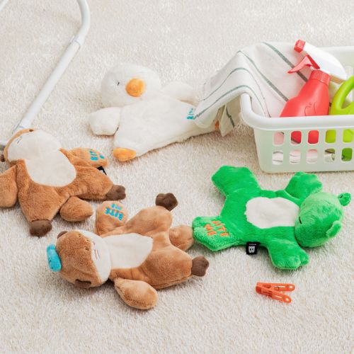 ぺたんこボディに6つのスクィーカーを詰め込み、どこを押してもピーピー鳴る仕掛けが楽しいぬいぐるみトイです。