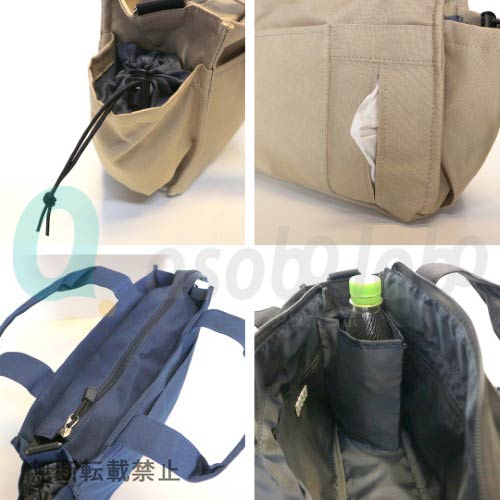 ● ボトルホルダー、マナーポケット、オープンポケット、ティッシュポケット、リードホルダー等の機能が付いたトートショルダーバッグです。