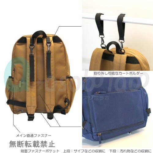 ●ベビーカーやカートに直接バッグを取り付けられるホルダーも付属(2本)。