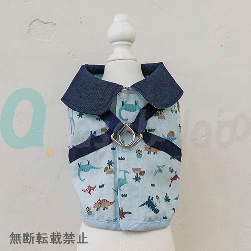 ポップでにぎやかなきょうりゅう柄に、ナチュラルなデニムのまる襟。
