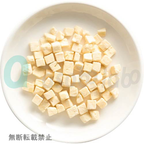 高タンパク・ミネラル・カルシウム豊富なナチュラルチーズを約1.5cmの一口サイズに角切りにしてからフリーズドライ加工しました。