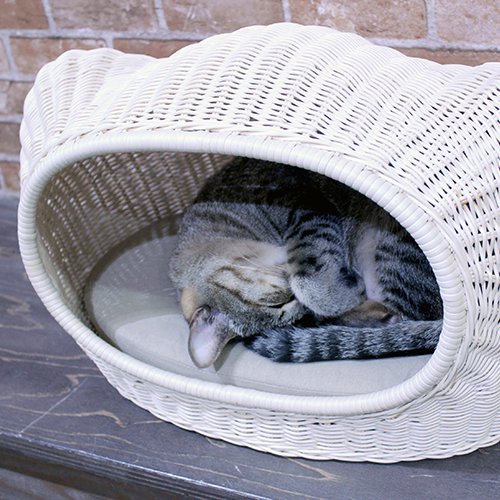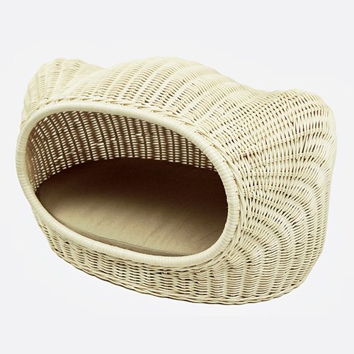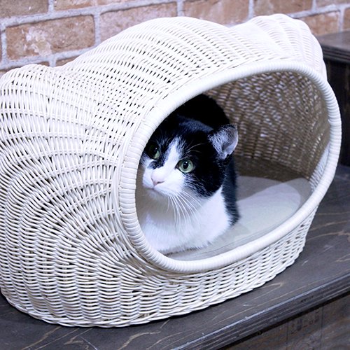 キャットフェイスをモチーフにした、ころんとかわいいラタンベッド。