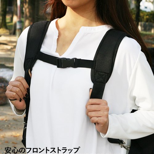 リュックは背負っている時に肩からベルトがずり落ちないように、バストの高さに両サイドのベルトを固定するパーツ(フロントストラップ)がついています。