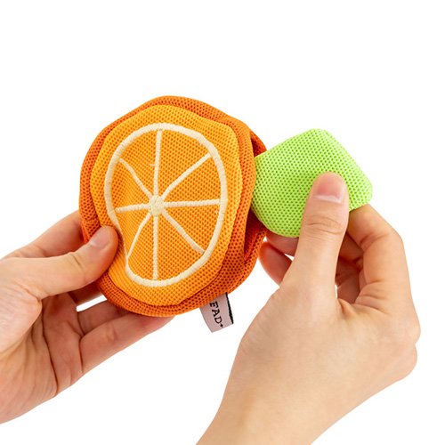 トリーツを隠せるポケットが2箇所付いた、フルーツモチーフの知育トイ★
