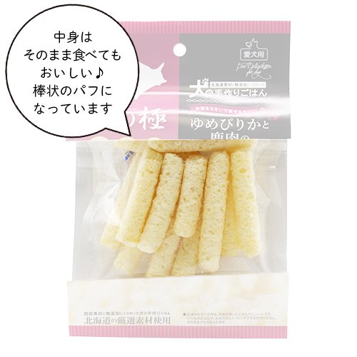甘みの強い北海道米「ゆめぴりか」と、鹿肉の出汁で作ったお米のパフです。