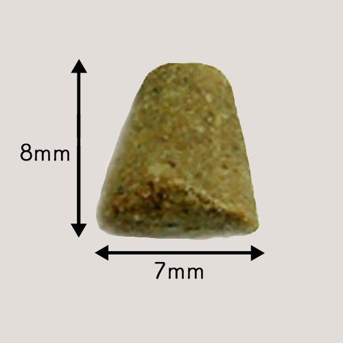 粗タンパク質 36.0%以上、粗脂肪 18.0以上、粗繊維 3.0%以下、粗灰分 7.5%以下、水分 10.0%以下、カルシウム 1.0%以上、リン 0.78%以上、マグネシウム 0.1%以下、カリウム 0.6%以上、ナトリウム 0.2%以上、オメガ6 3.25%以上、オメガ3 2.0%以上、グルコサミン 600mg/kg以上、コンドロイチン 500mg/kg以上