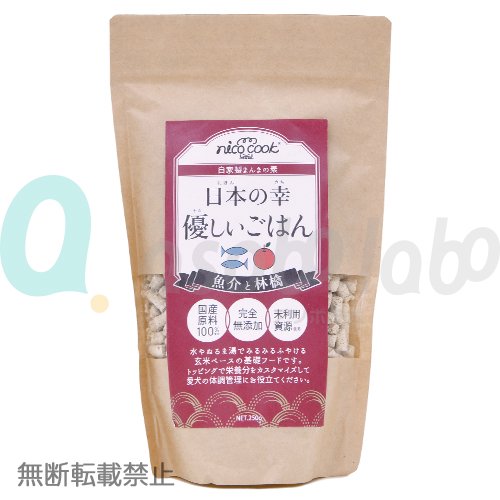 【原材料】玄米(国産)、鱈(国産)、鰯(国産)、サーモン(国産)りんご(国産)、サツマイモ(国産)、まぐろ(国産)、ほたて(国産)ごぼう(国産)、昆布(国産)、ドライ納豆(国産)