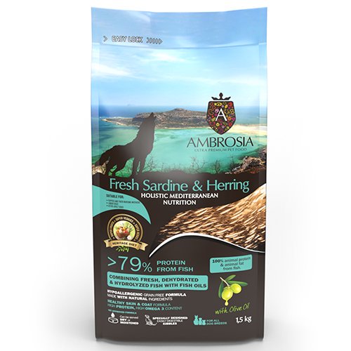 こちらの「アンブロシア HMNサーディン&ヘリング」は、たんぱく質の79%が魚でできた、ハイプロテイン・ハイOmega3のドッグフードです。