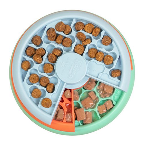 上のプレートを動かさないと、下のプレートに入っているフードが食べられない仕組みになっています。