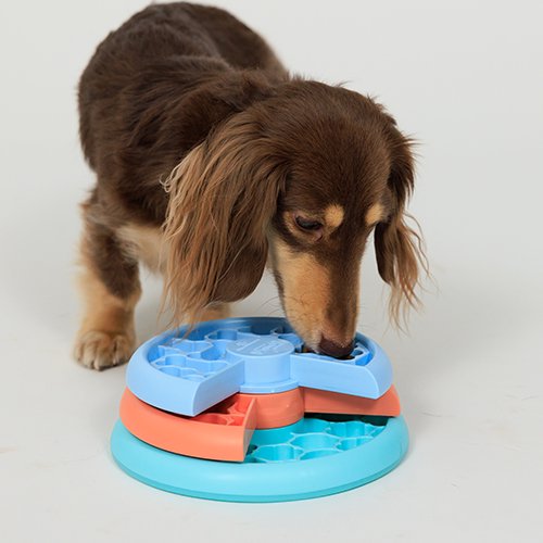 「Nina Ottosson トリーツ・ゲーム」シリーズの要素を含む、3層構造のスローフィーダー。