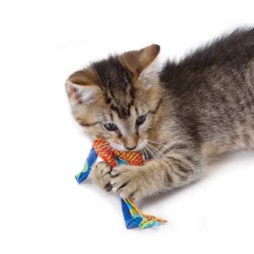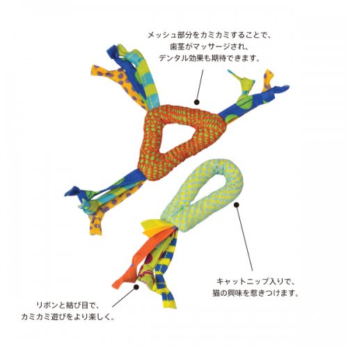 リボンはネコの大好きなキャットニップ(ハーブ)をくるんでいて、興味を惹きつけながら刺激を与えることでいつまでもよく遊びます。