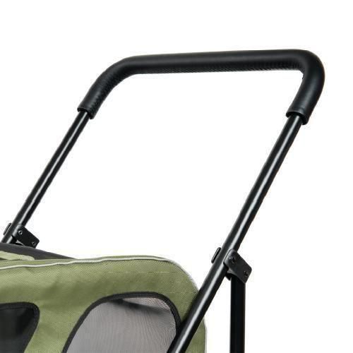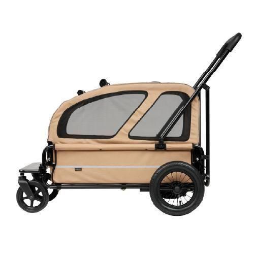 体重の重い大型犬を乗せても、4輪の安定性と3角構造の軽快な押し心地でスムーズな走行が可能です。愛犬が開放的に乗ることができるオープンタイプで、荷物が多い時は台車としてもご使用いただけます。また、別売りのルーフ(別売り)を装着すれば、突然の飛び出しや移動時にも安心。本体後部にはスロープを装備し、足腰の弱い老犬でも乗り降りがしやすいデザインになっています。