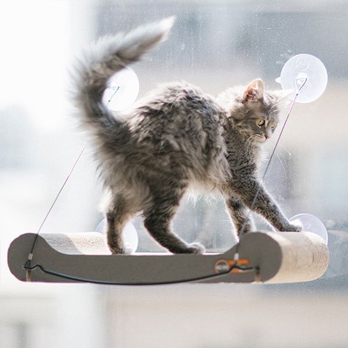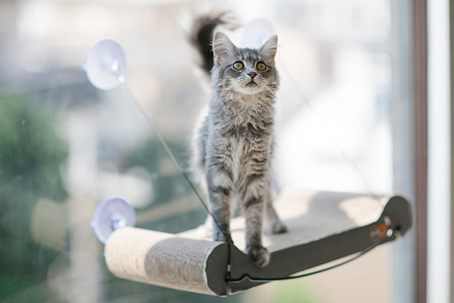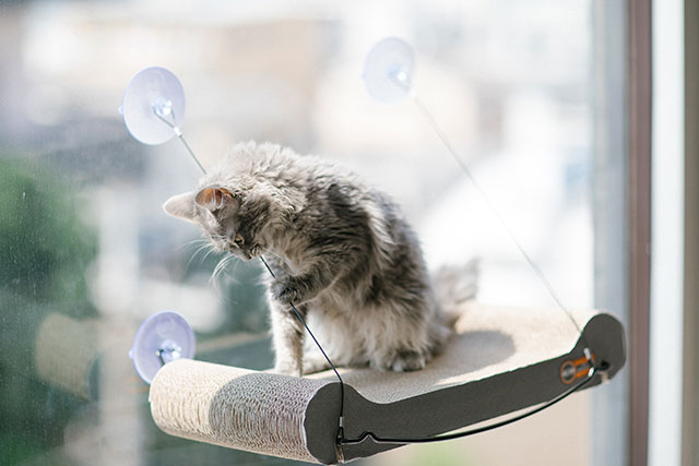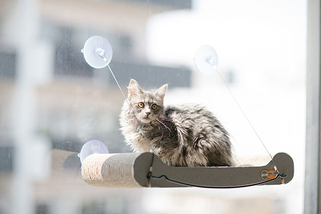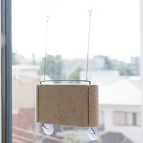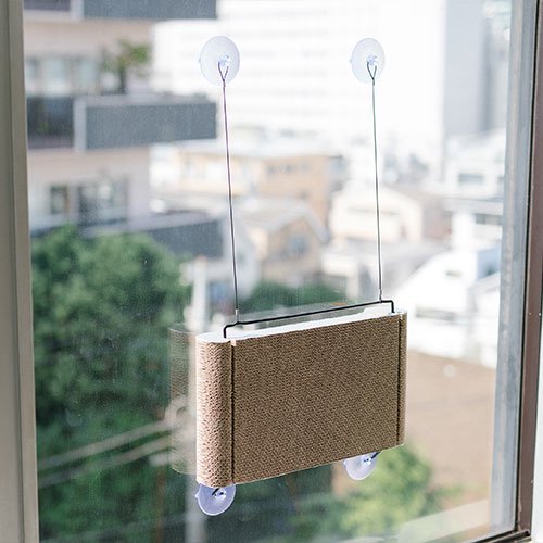 吸盤で窓に取り付けられて、爪とぎにもなる猫ベッド。